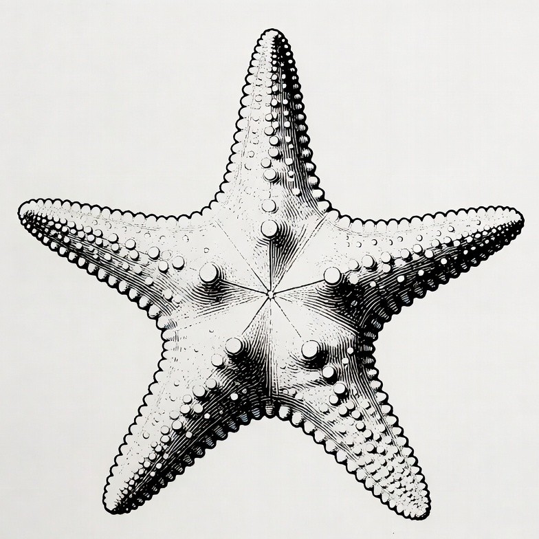 black and white, clipart, detailed, echinoderm, five arms, illustration, isolated background, marine animal, ocean creature, sea star, spines, symmetrical, textured, vintage drawing, starfish