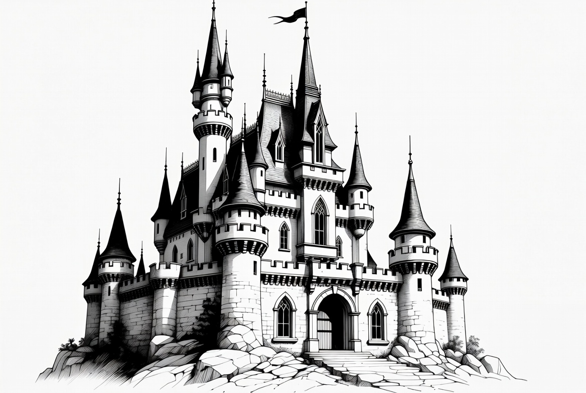 A detailed black and white illustration of a majestic fairy tale castle with numerous tall spires and towers. The castle features a central flag atop the highest tower and is built on a rocky base with stone walls and arched windows. It stands isolated against a plain background.