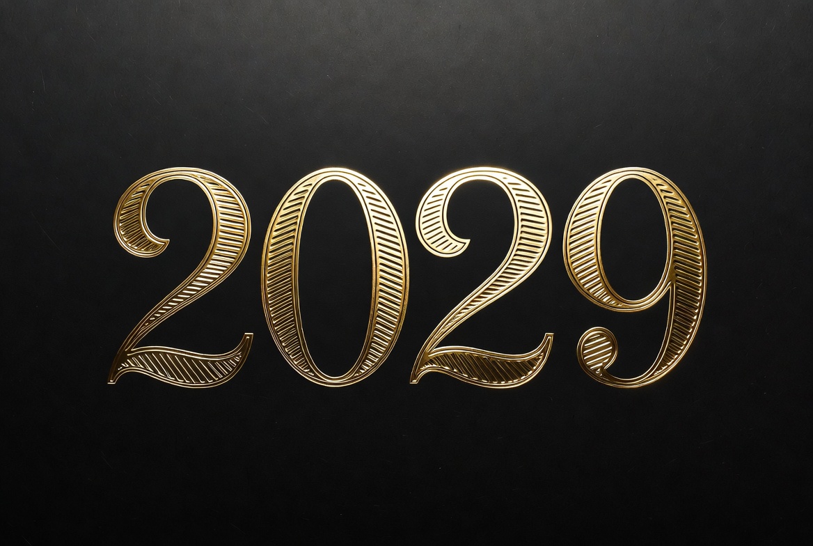3D text, black background, bold numbers, dark backdrop, digits, elegant text, engraved, future year, gold text, golden numerals, graphic design, isolated, luxury font, metallic, new year, numbers, shiny, typography, year 2029, 2029