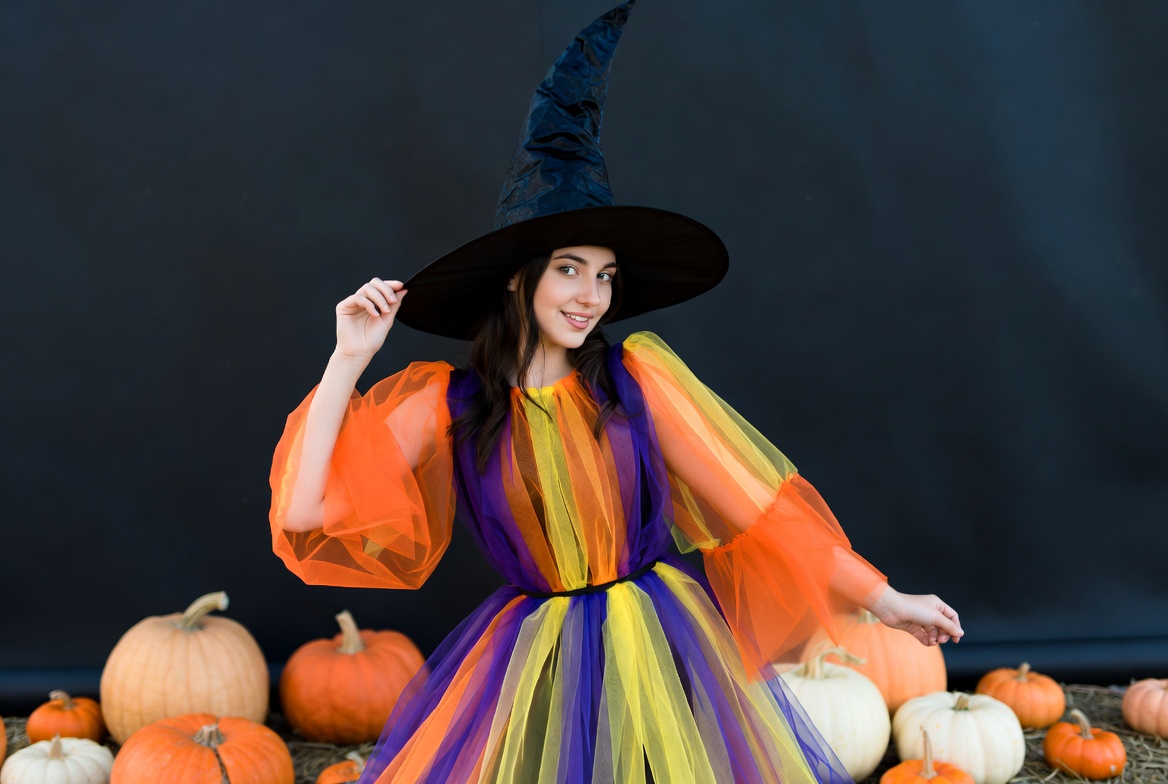 A young woman with long dark hair wears a wide-brimmed black witch hat and a sheer, multicolored striped dress with puffed orange sleeves. She poses playfully with one hand on her hat against a dark background. Several orange and white pumpkins are scattered on the ground around her.