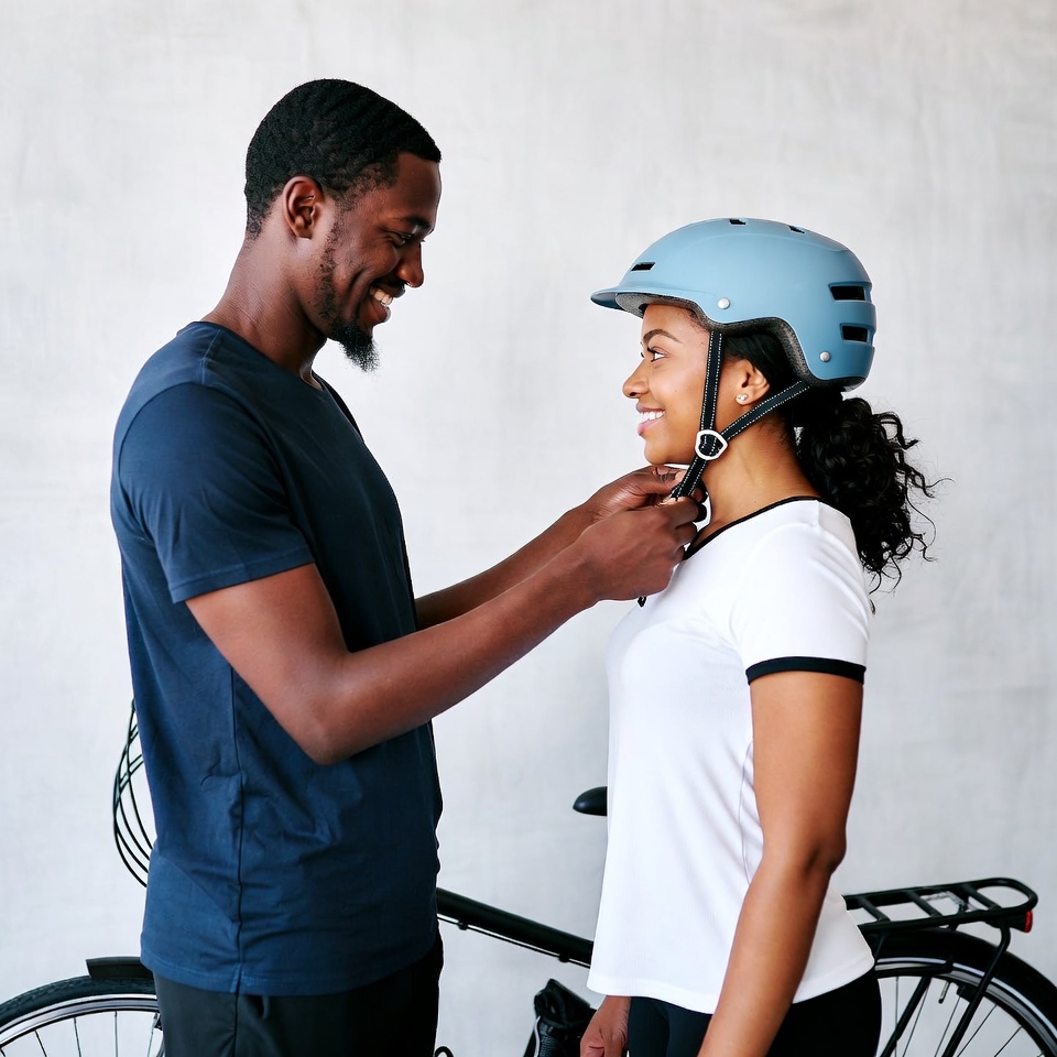 A Black man in a blue t-shirt smiles while adjusting a blue bicycle helmet on a smiling Black woman wearing a white shirt. They stand close together next to a black bicycle on a plain white background. The woman has curly hair in a ponytail and both appear happy.