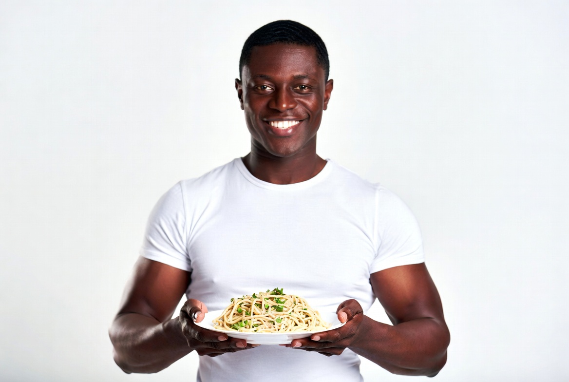 A muscular African-American man with a big smile holds a large white plate of spaghetti topped with green herbs. He wears a plain white t-shirt and stands confidently against a white background. The pasta is piled high on the plate in his hands.