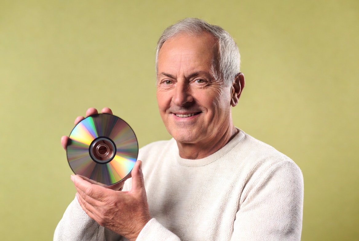 A senior White man with gray hair smiles while holding up a shiny CD disc in his hands. He wears a light-colored sweater and stands against a solid green background. The CD reflects light, showing its iridescent surface.