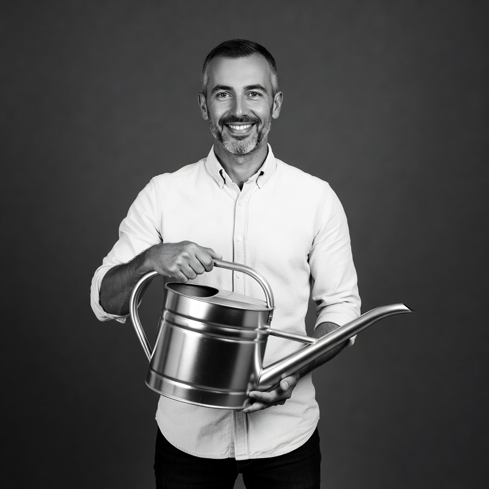 A middle-aged man with short gray hair and a beard smiles while holding a large metal watering can in both hands. He wears a white button-up shirt with rolled sleeves and dark pants, standing against a plain dark gray background. The image is in black and white.