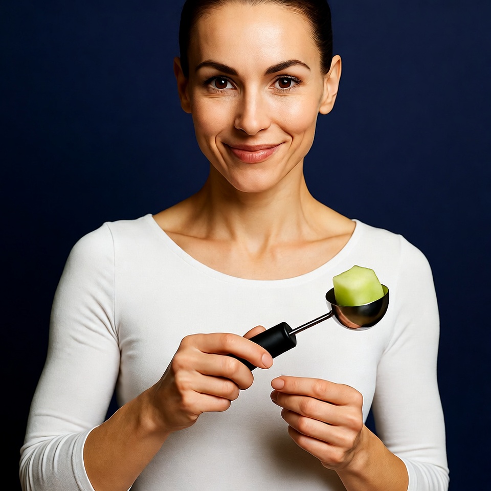 A smiling woman with dark hair in a bun stands against a blue background, wearing a white long-sleeve top. She holds a metal scoop with a green melon ball towards the camera. Her expression is happy and engaging.