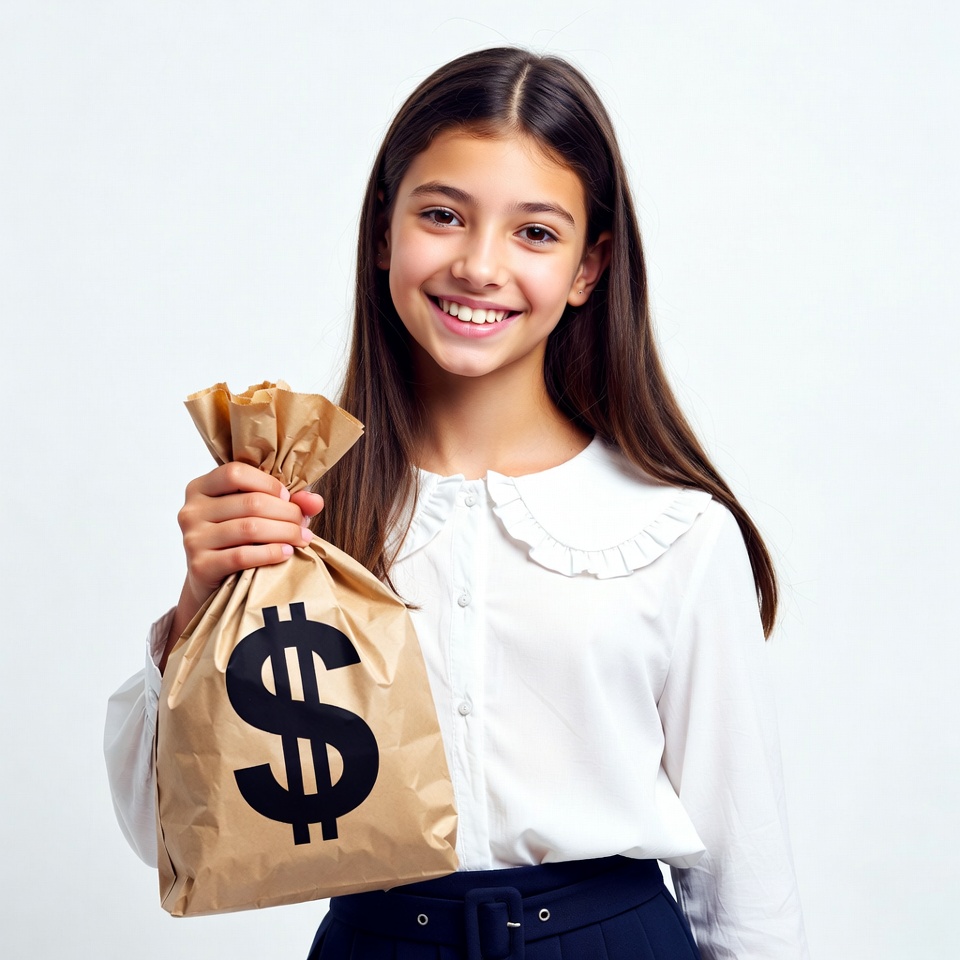 A young girl with long dark hair smiles while holding a large brown money bag marked with dollar signs. She wears a white collared blouse and navy skirt, standing against a white background. The bag is clutched in her right hand.