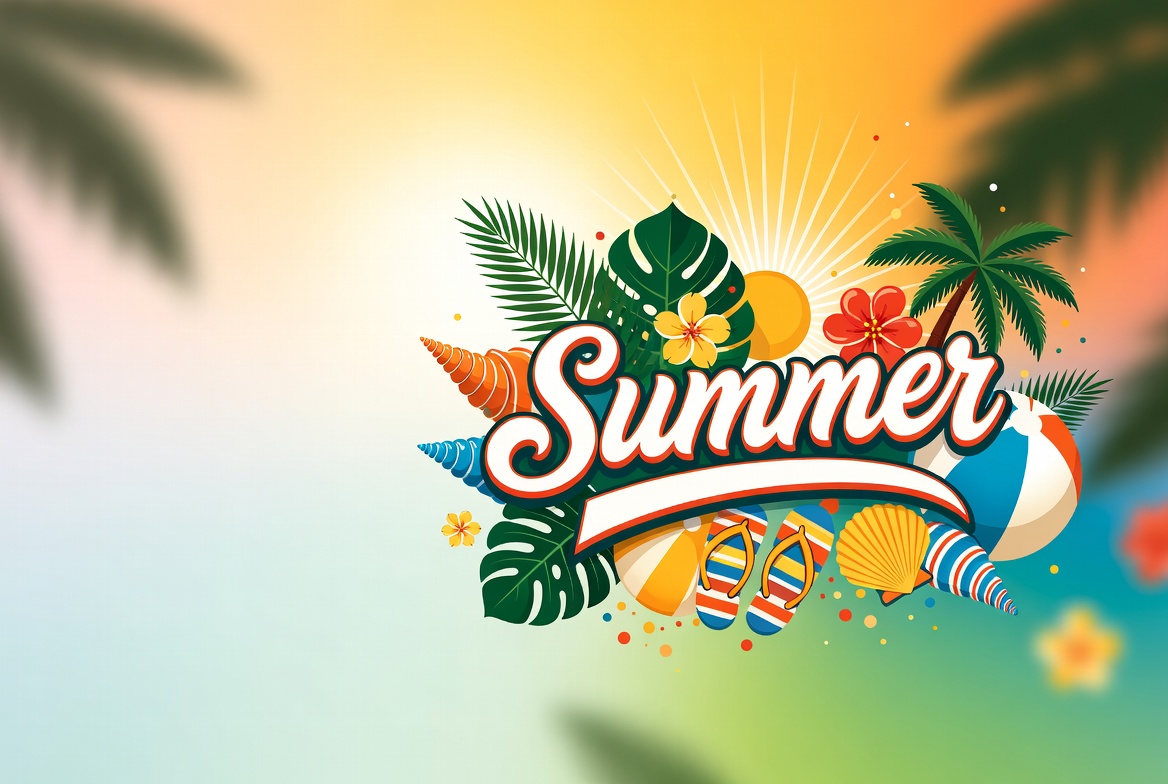 Colorful clipart illustration features the word 'Summer' in bold white and blue script lettering. Surrounding elements include palm leaves, monstera plants, a sunburst, beach ball, flip-flops, seashells, and hibiscus flowers. The design is set against a gradient sunset background with tropical shadows.