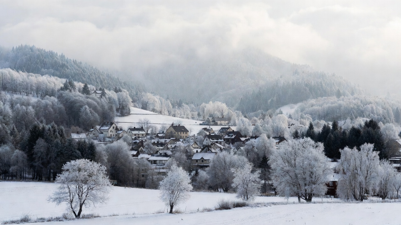 A picturesque village with clustered houses covered in snow sits in a valley surrounded by frosted trees and rolling hills. Thick fog and clouds partially obscure the distant mountain peaks under a pale winter sky. The landscape features white fields and bare trees heavy with frost.