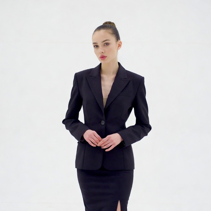 A young woman with long dark hair in a bun stands confidently against a white background. She wears a tailored black blazer with a deep V-neck and a matching pencil skirt with a side slit. Her hands are clasped in front, and she has subtle makeup with pink lips.
