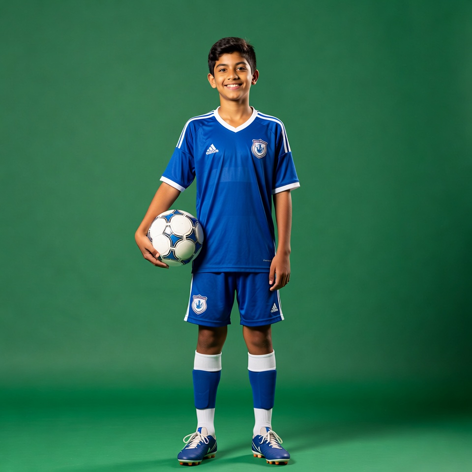 Adidas, South Asian, athlete, ball, blue jersey, child, cleats, football, green background, kid soccer, male, portrait, shorts, smiling, soccer, soccer ball, soccer uniform, socks, sports, standing, team logo, uniform, young boy, boy