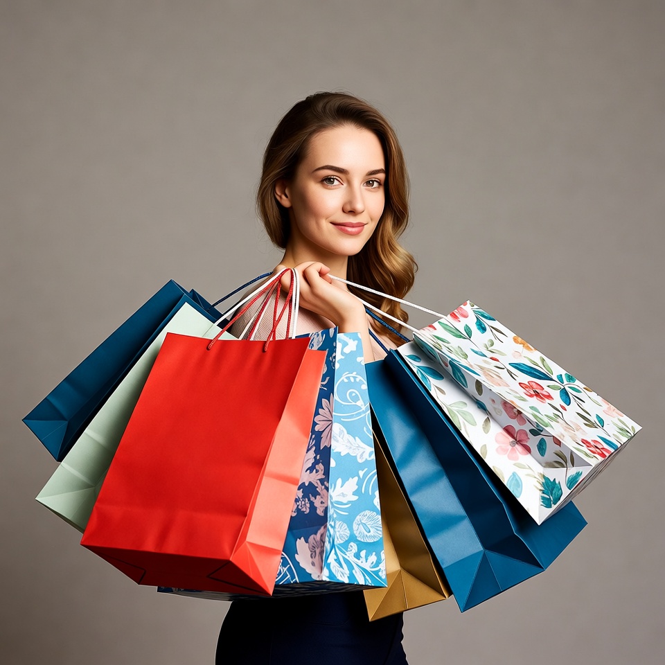 A smiling woman with long wavy brown hair stands holding multiple colorful shopping bags in her hands. The bags feature various patterns including floral designs in red, blue, green, and gold tones. She wears a dark outfit against a plain gray background.