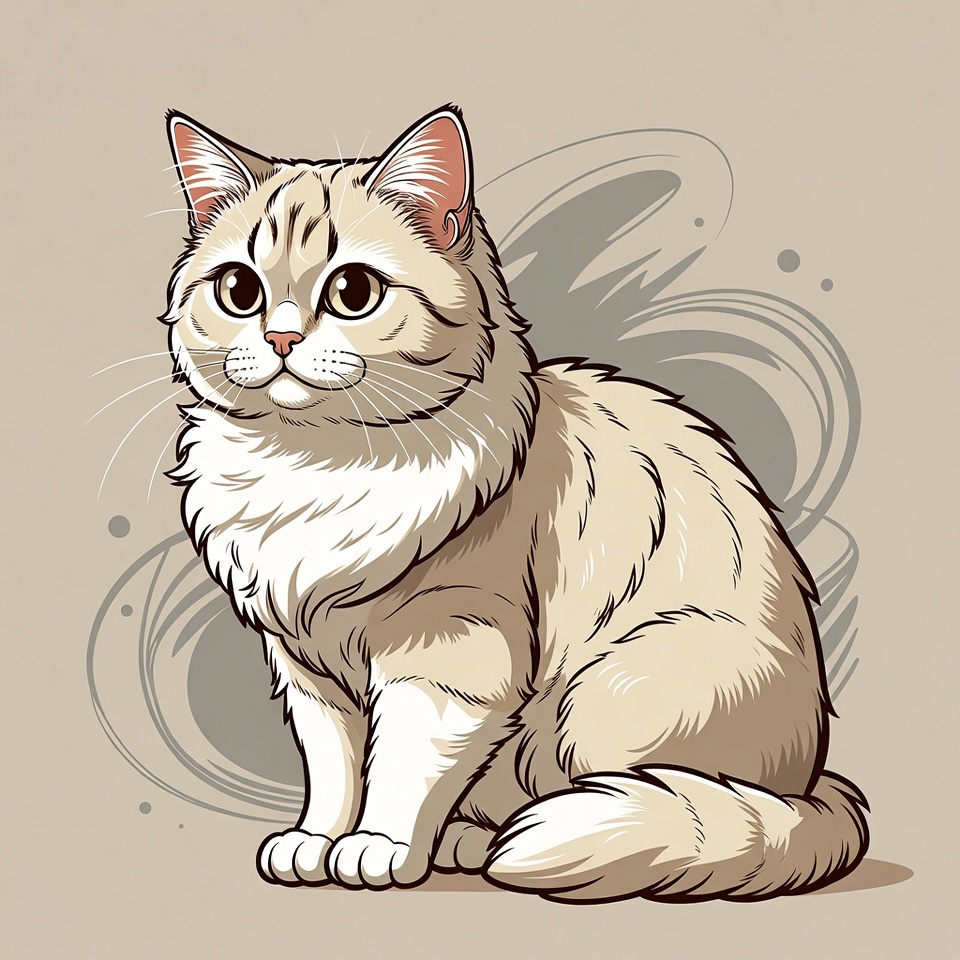 A fluffy cream-colored cat with large expressive eyes sits on a light background. The digital illustration features detailed fur texture and subtle gray swirls behind the cat. The cat's paws are tucked neatly under its body.