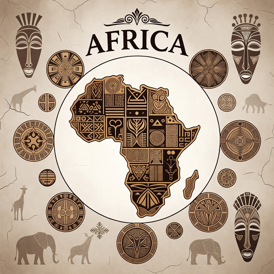 African masks, antelope, beige background, brown tones, circular motifs, clipart, continent map, cultural symbols, decorative, elephant, geometric patterns, giraffe, illustration, isolated background, ornate, textured, traditional masks, tribal art, vintage design, wildlife, Africa map