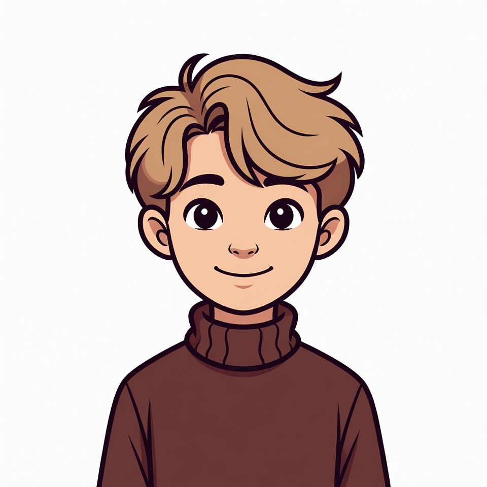A cute cartoon boy with fluffy blonde hair and large expressive eyes smiles at the viewer. He wears a brown turtleneck sweater that covers his neck. The illustration features a clean white background.