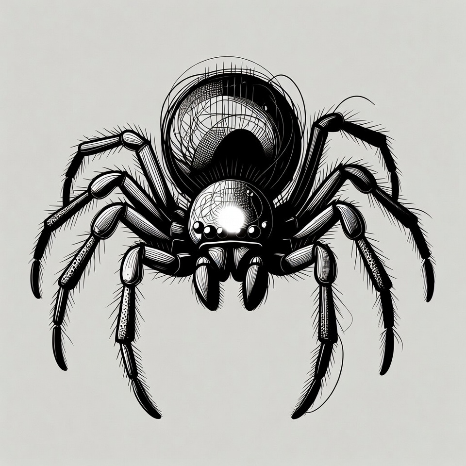 arachnid, black ink, creepy crawly, drawing, eight legs, graphic design, hairy legs, illustration, isolated background, line art, shiny abdomen, tarantula, vector art, wolf spider, spider