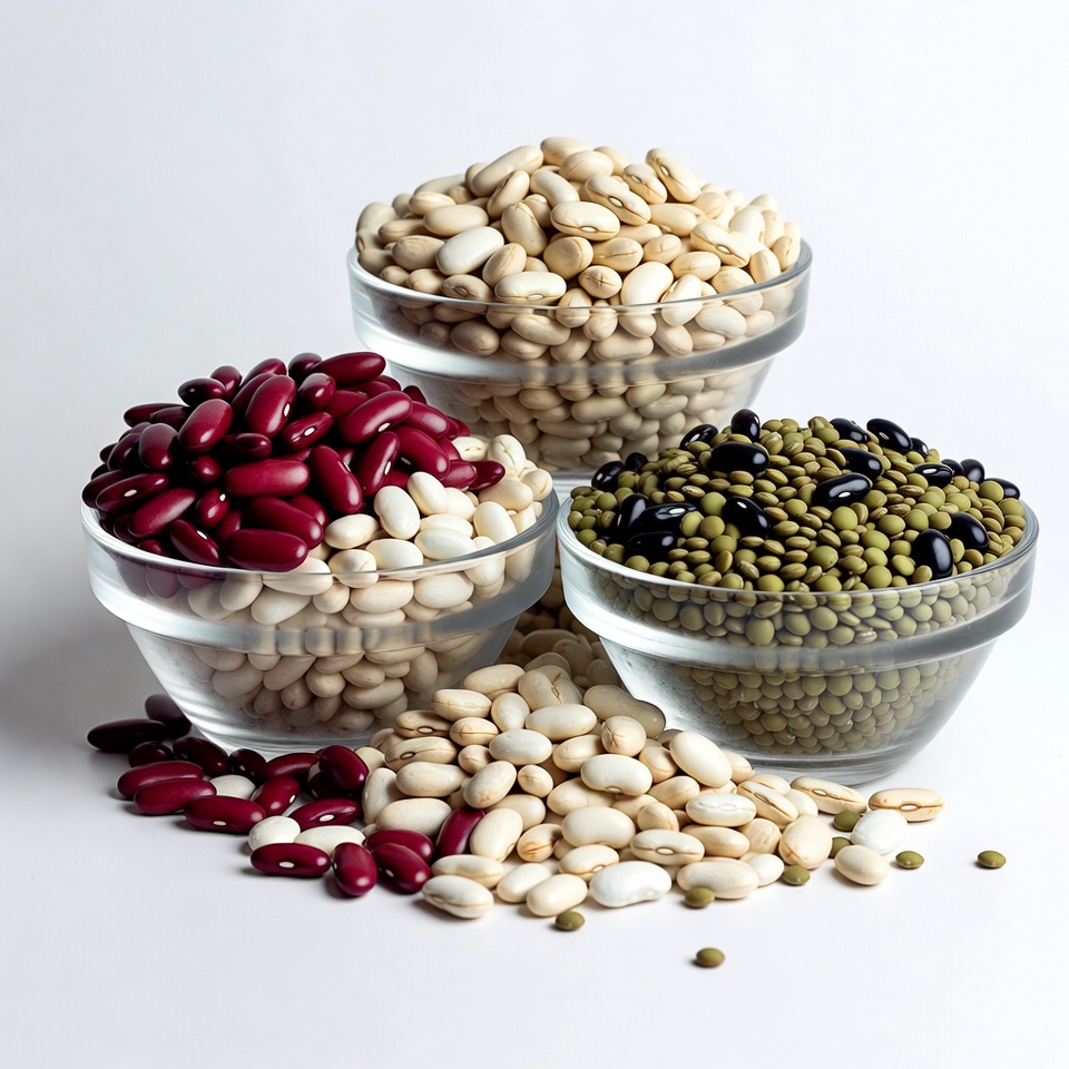 Three glass bowls contain different varieties of beans on a white background. One bowl holds red kidney beans, another white beans, and the third green mung beans. Scattered beans of each type surround the bowls.