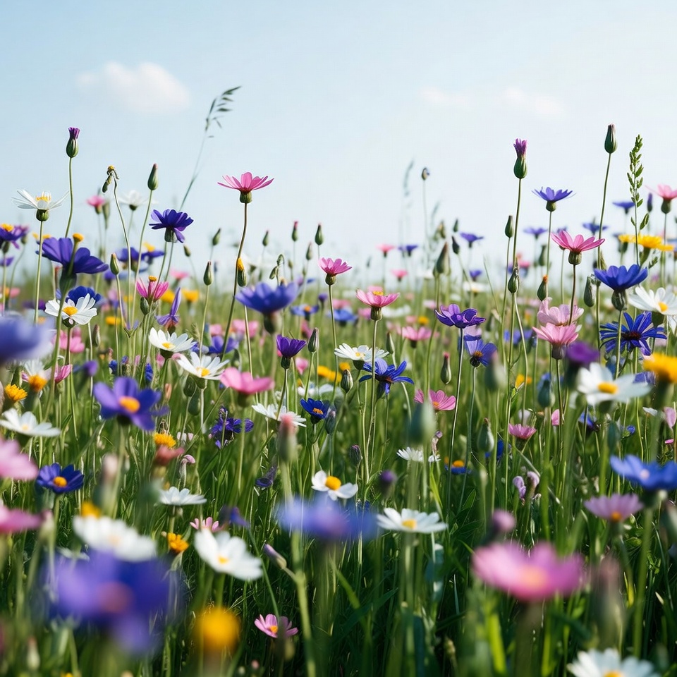 A vibrant field of wildflowers features blue, pink, purple, yellow, and white blooms swaying in the green grass. Tall stems and buds rise against a clear blue sky with scattered white clouds. The flowers are densely packed in the foreground under bright daylight.