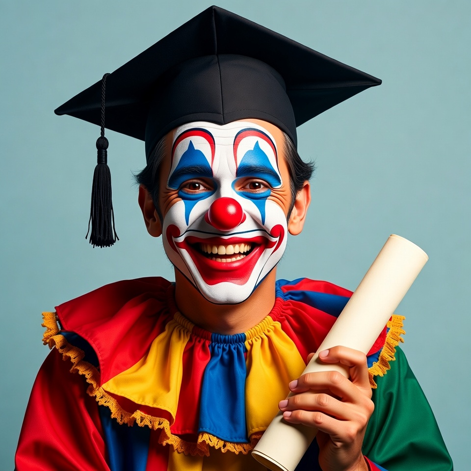 A male clown with white face paint, blue eye makeup, and red nose wears a black graduation cap and colorful ruffled costume. He smiles widely while holding a white diploma in his hand. The image is set against a solid light blue background.