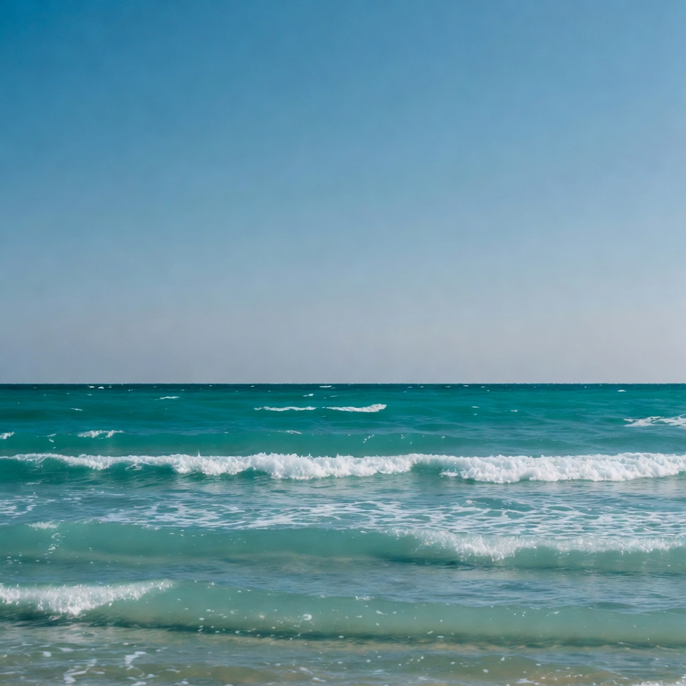 Vibrant turquoise ocean waves crash gently onto a sandy beach shore. A clear blue sky stretches above the horizon with scattered whitecaps on the water. The scene captures the dynamic movement of the sea under bright daylight.