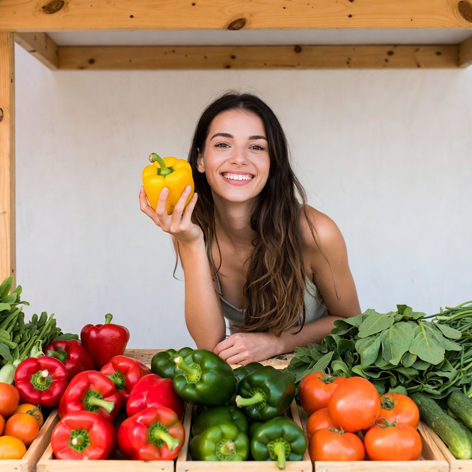 A smiling woman with long wavy brown hair holds a large yellow bell pepper in her hand while standing behind a wooden market stall. The stall is filled with fresh vegetables including red peppers, green peppers, tomatoes, cucumbers, and greens in wooden crates. She wears a light-colored top and leans forward with a bright smile.