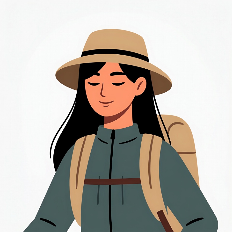 A young Asian woman with long black hair smiles gently with eyes closed. She wears a beige wide-brim hat, a teal zip-up jacket, and a tan backpack with straps. The illustration features her on an isolated white background.