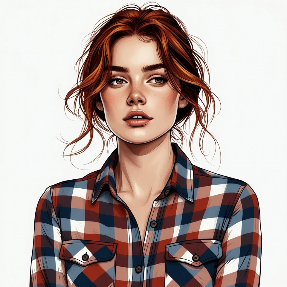 A young woman with long wavy red hair gazes forward with green eyes and subtle makeup. She wears an open red and blue plaid shirt over a white top. The digital illustration is set against a plain white background.