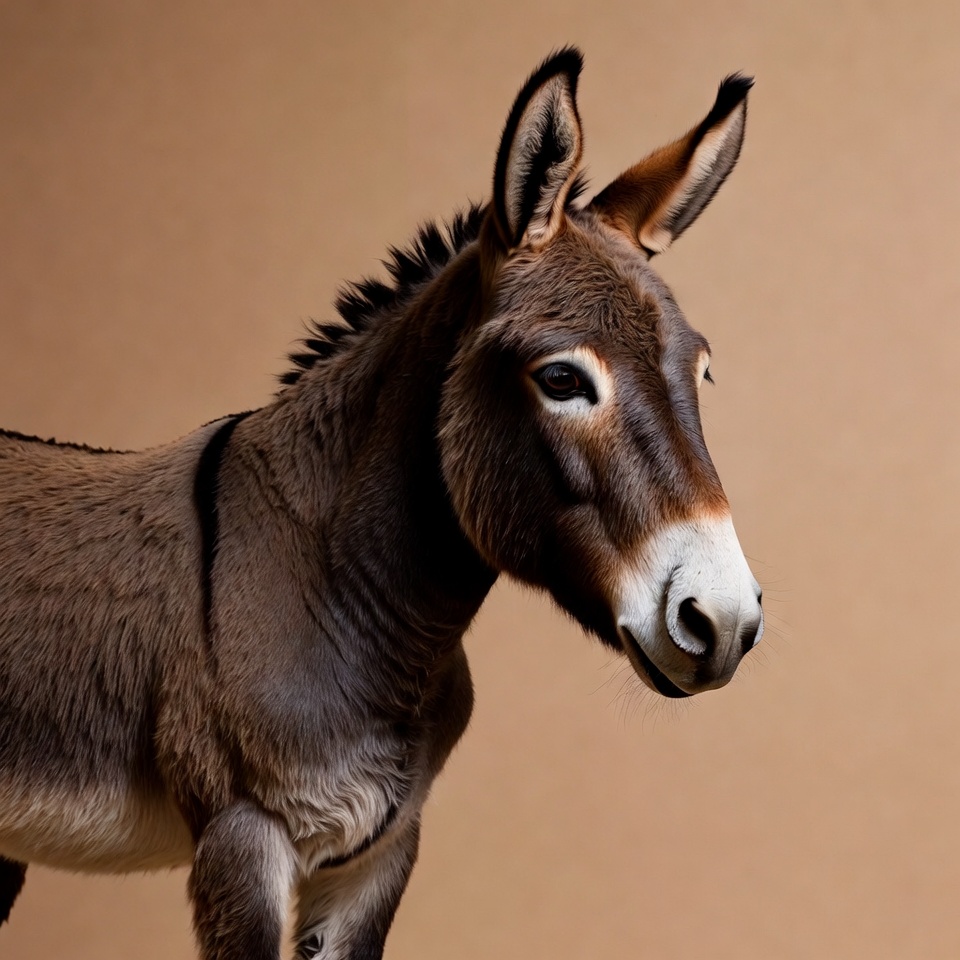 A brown donkey with large ears and expressive eyes faces the camera on a beige background. Its mane is spiky, and it has a white muzzle with dark nostrils. The donkey stands in profile, showing its fluffy fur and gentle expression.