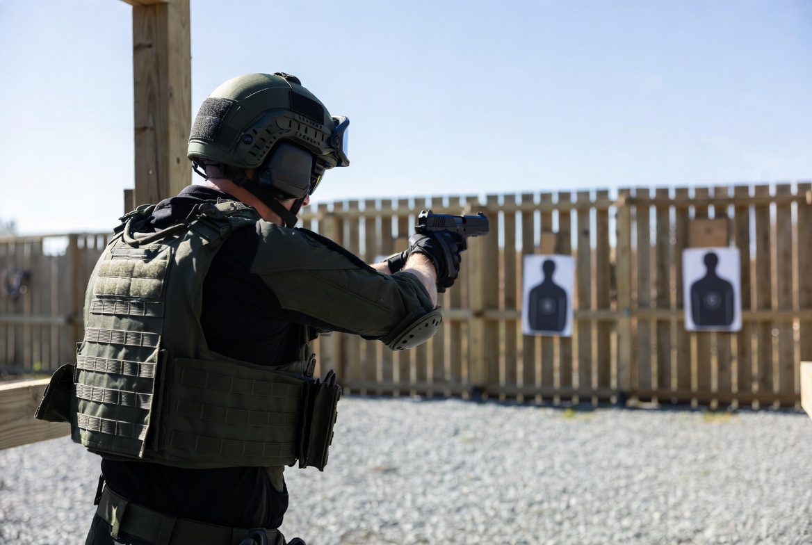 aiming, clear sky, firearms, gloves, gravel ground, gun, helmet, male, man, military, outdoor, pistol, plate carrier, practice, shooting, shooting range, silhouette targets, special forces, tactical gear, targets, training, vest, wooden fence, soldier