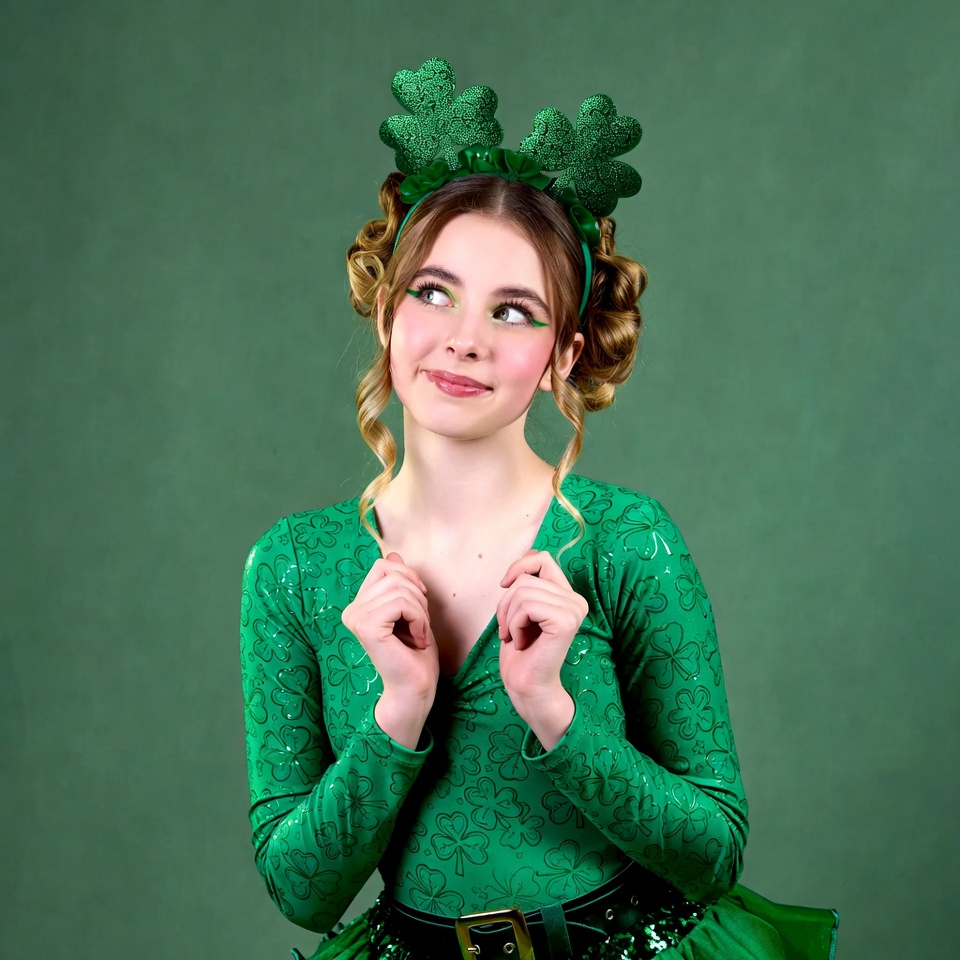 A young White girl with curly blonde hair wears a green shamrock headband and sparkly green shamrock-patterned bodysuit. She stands thoughtfully with hands clasped near her chest against a solid green background. Her outfit includes a green tutu skirt and gold belt for a St. Patrick's Day look.