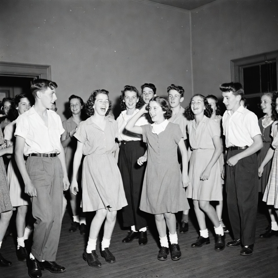 1950s style, White, black and white, boys, collars, dancing, dresses, female, girls, group dance, gymnasium, male, retro photo, school gym, school uniforms, short sleeve shirts, teenagers, white socks, wooden floor, young people, vintage teens