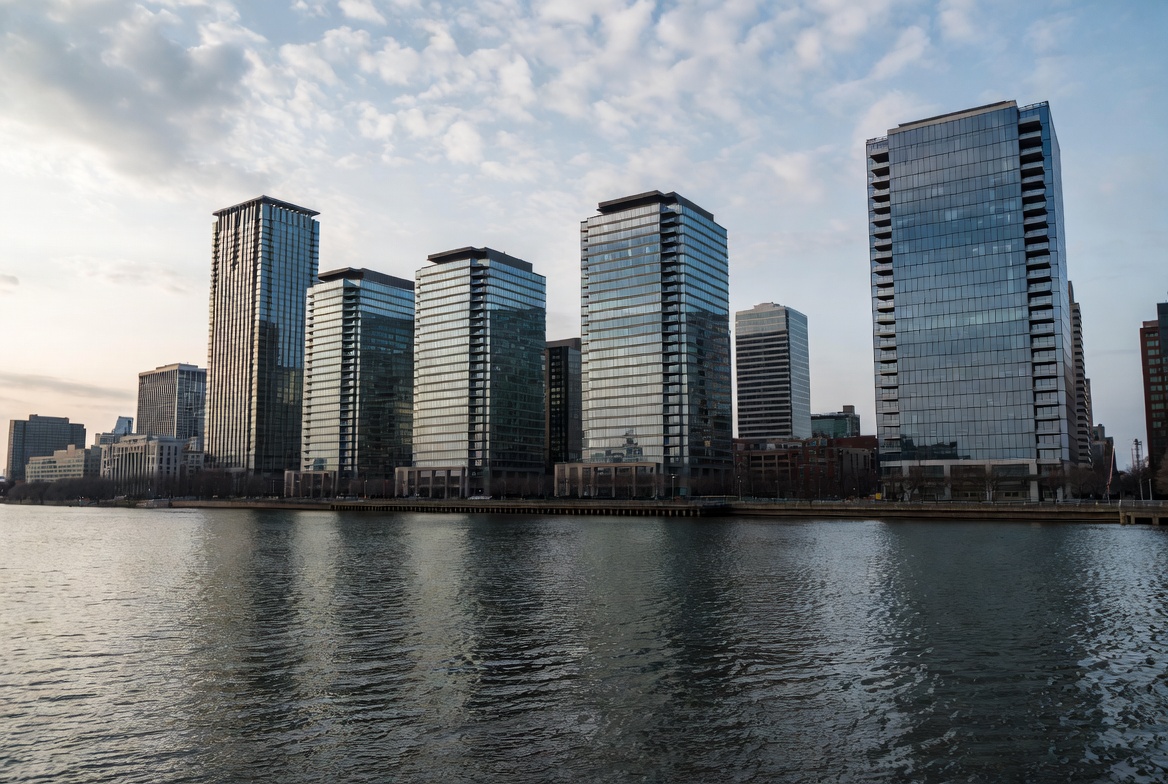 architecture, blue hour, buildings, city skyline, cityscape, cloudy sky, dusk, glass buildings, high-rise buildings, highrises, metropolis, modern architecture, reflections, river, riverfront, towers, urban landscape, water reflection, waterfront, skyscrapers