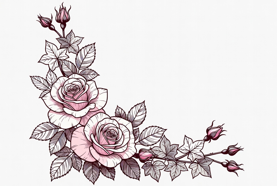 botanical illustration, bouquet corner, clipart, corner design, decorative roses, elegant design, floral art, floral border, flower illustration, graphic element, green leaves, hand drawn, illustration, isolated background, line art, petals, pink flowers, rose buds, rose cluster, roses, stems, tattoo design, vector art, watercolor style, pink roses