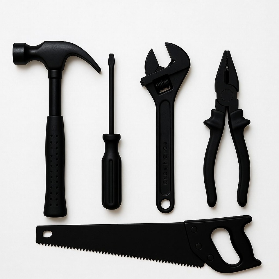 A set of black hand tools including a claw hammer, screwdriver, adjustable wrench, pliers, and handsaw are arranged on a plain white background. The tools are laid out straight and isolated for clear visibility. Each tool features a matte black finish with ergonomic handles.