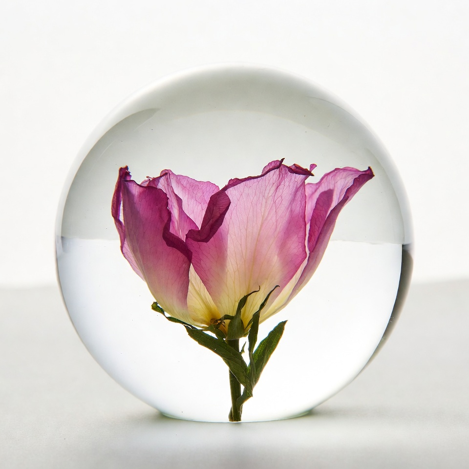 clear orb, closeup flower, floral art, flower inside sphere, glass sphere, green stem, isolated background, macro photography, nature photography, refraction effect, rose flower, transparent glass, white background, wilted petals, pink rose