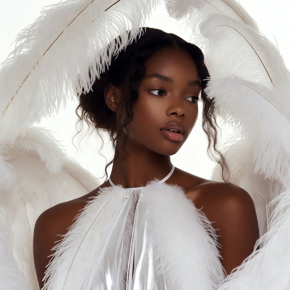 A beautiful Black woman with curly hair styled in an updo gazes at the camera. She wears a shiny silver halter top and is surrounded by large white feathers forming a frame. Her skin glows warmly against the white feathers.
