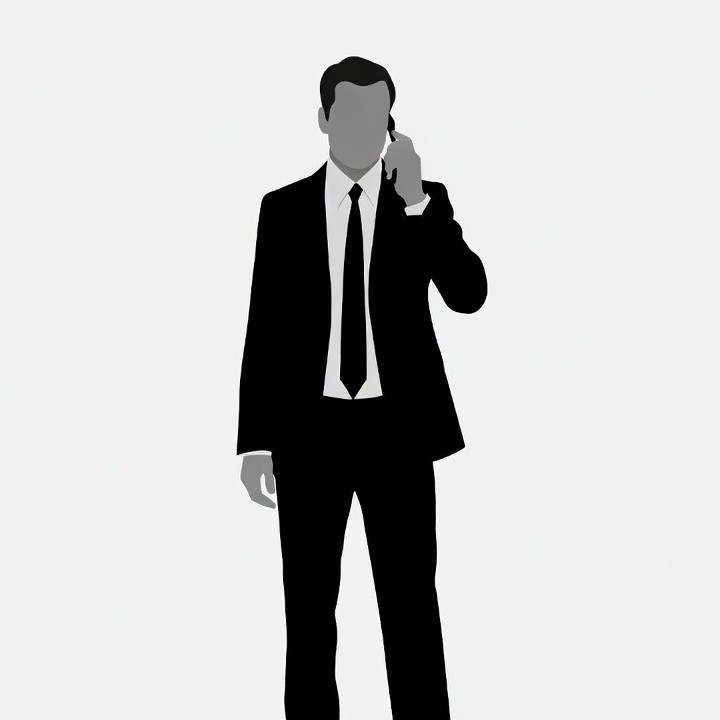 A black silhouette illustration of a man in a suit and tie stands against a light gray background. He holds a phone to his ear with his right hand raised. The figure is detailed in formal business attire including a jacket, pants, and necktie.