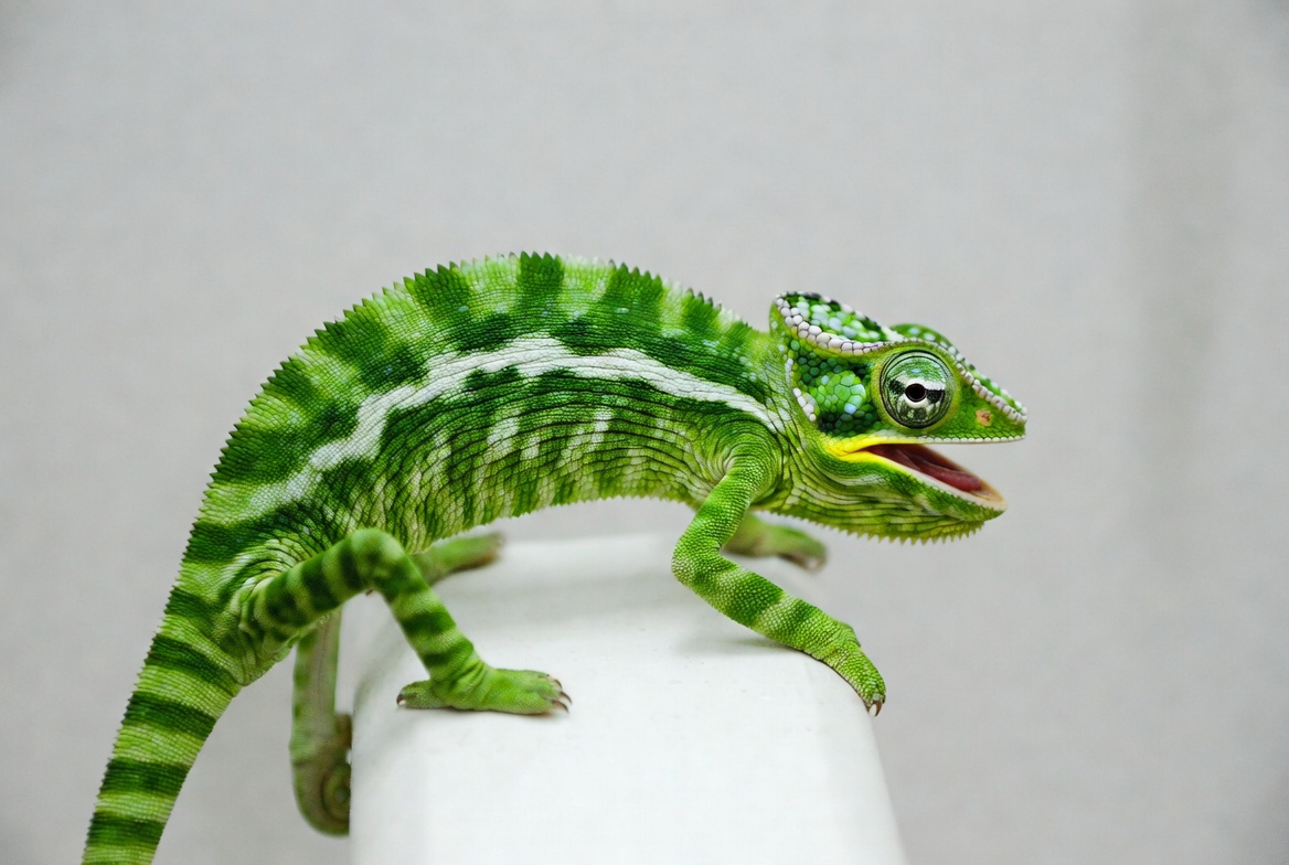 A vibrant green chameleon with intricate striped patterns stands on a white surface. It has a prominent casque on its head, bulging eyes, and a wide-open yellow mouth. Its textured feet grip the smooth background.