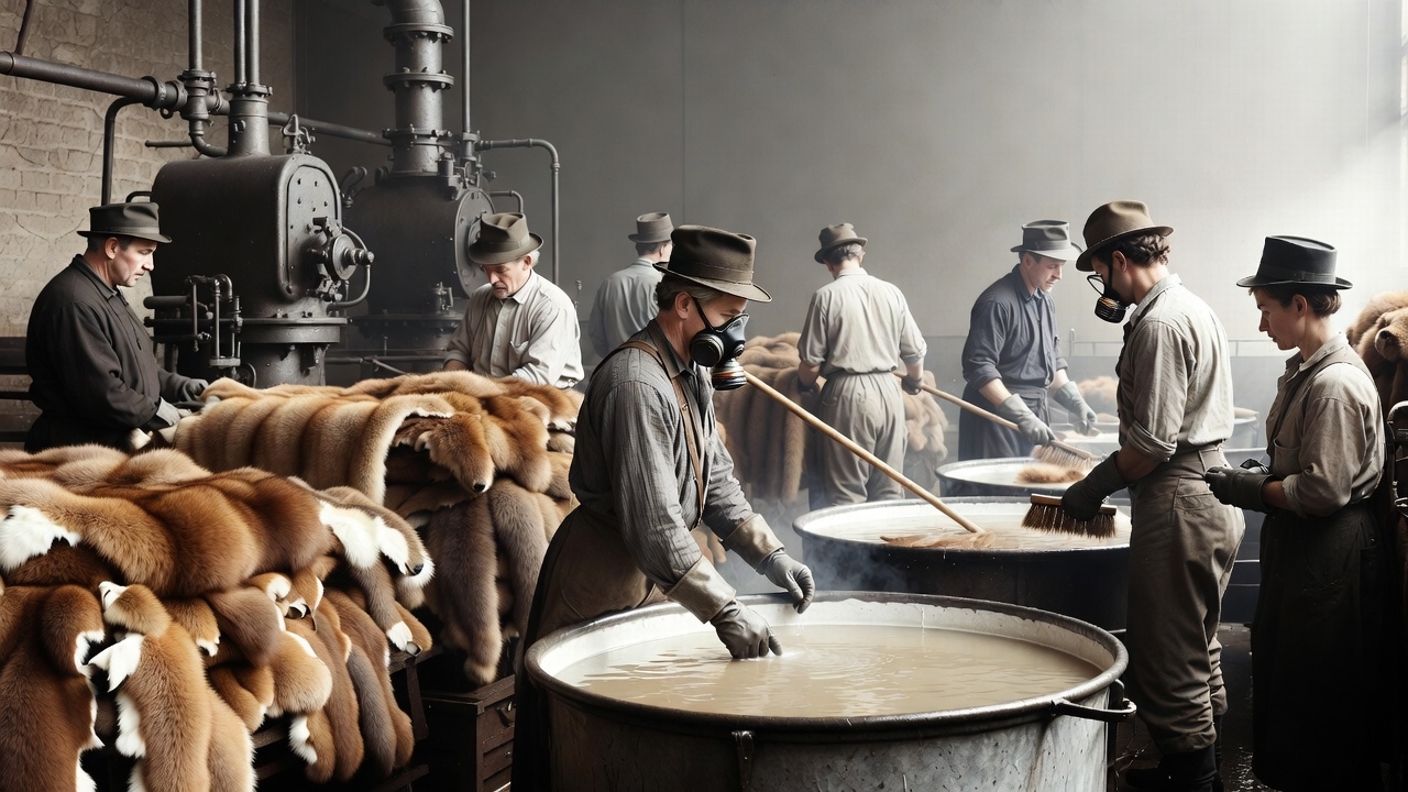 Several men in early 20th-century attire and hats work in a dimly lit tannery. They stir large vats of liquid and handle stacks of fox fur pelts with gloves and gas masks. Industrial machinery and pipes line the background amid piles of reddish-brown furs.