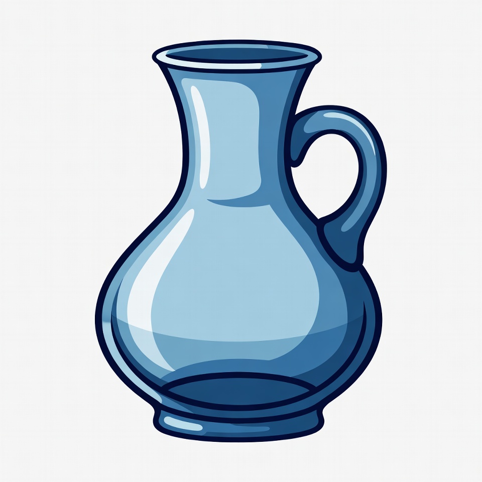 A vibrant blue vase with a handle and curved shape is illustrated in a cartoon style. It features glossy highlights and smooth outlines on a white isolated background. The design resembles a classic pitcher.
