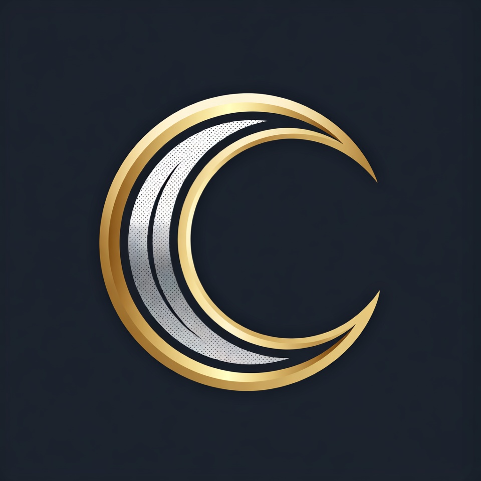 A detailed golden crescent moon icon features a metallic gold outline with a textured white inner layer. The design is set against a solid dark blue background, creating a striking contrast. The moon shape has sharp, curved edges with subtle shading for a 3D effect.