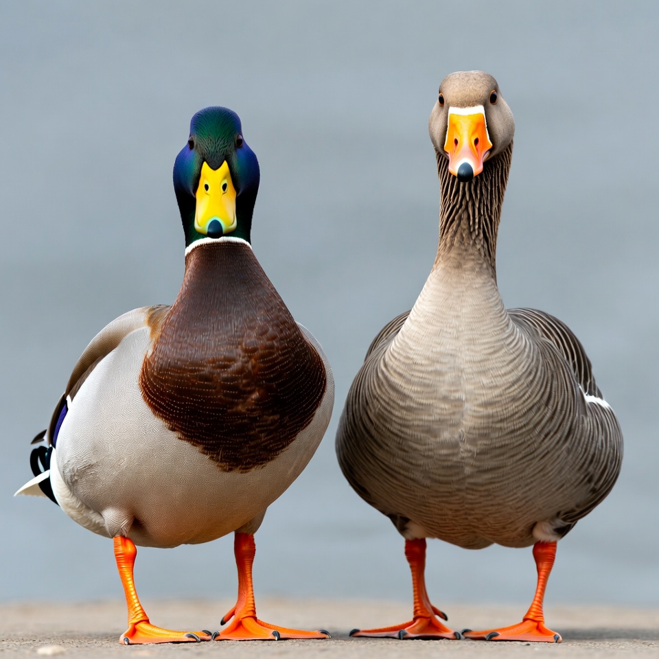 A male mallard duck with green head, yellow bill, and brown chest stands next to a gray goose with orange bill on a gray background. Both birds face forward with wings slightly folded and orange legs visible. They appear side by side in a close-up view.