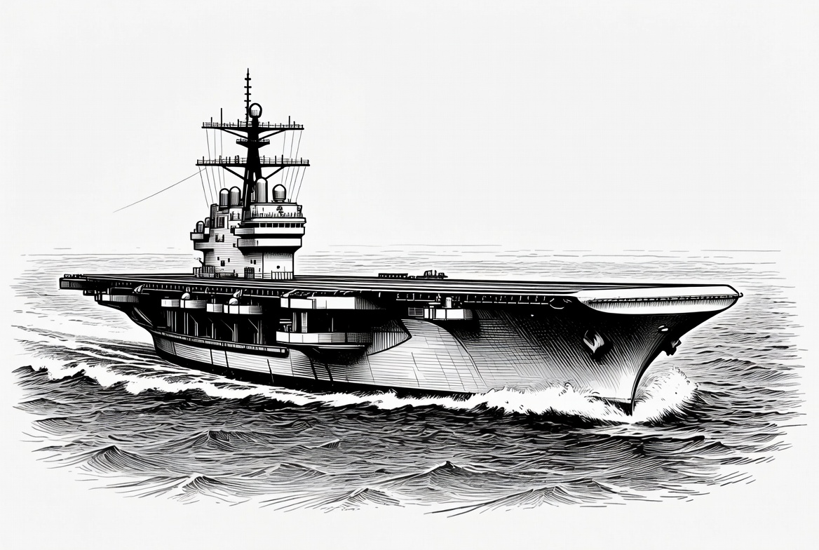 Black and white illustration of a large aircraft carrier sailing through choppy ocean waves. The ship features a flat deck, multiple superstructures, antennas, and detailed hull lines. It is depicted in a vintage engraving style on an isolated background.