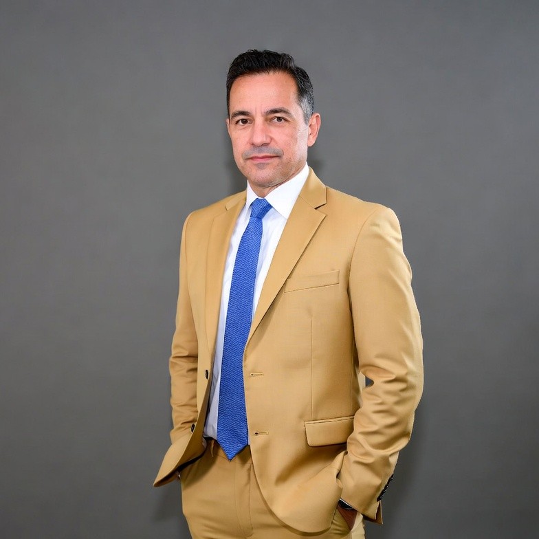 A middle-aged man with short dark hair and a trimmed beard stands confidently against a gray background. He wears a tan suit jacket, white dress shirt, and blue tie, with hands in his pockets. His expression is neutral and professional.