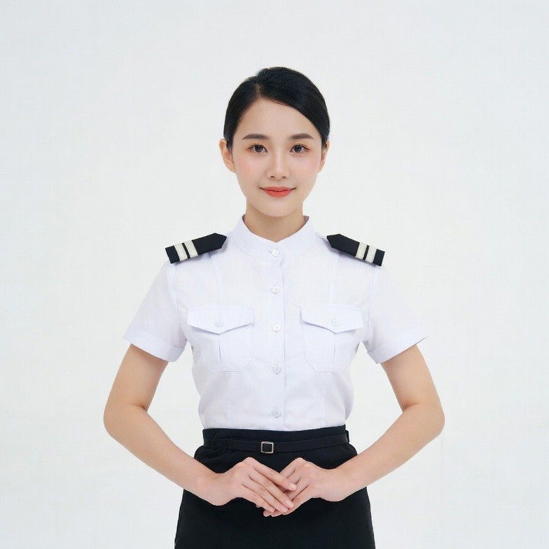 A young Asian woman stands with hands clasped in front of her on a white background. She wears a crisp white short-sleeve uniform shirt with black epaulets and a black skirt. Her black hair is neatly styled and she smiles at the camera.