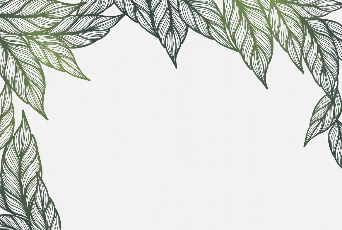 A detailed line art illustration of green leaves forms a decorative border around a white background. The leaves are intricately drawn with fine linework in shades of green and white outlines. It is arranged in a corner frame design.