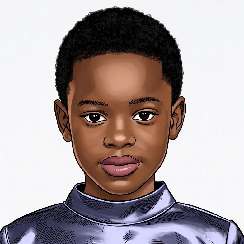 A digital illustration of a young African-American boy with short curly black hair and large expressive eyes stares directly at the viewer. He has smooth brown skin and glossy pink lips. He wears a shiny metallic blue collar shirt on an isolated white background.