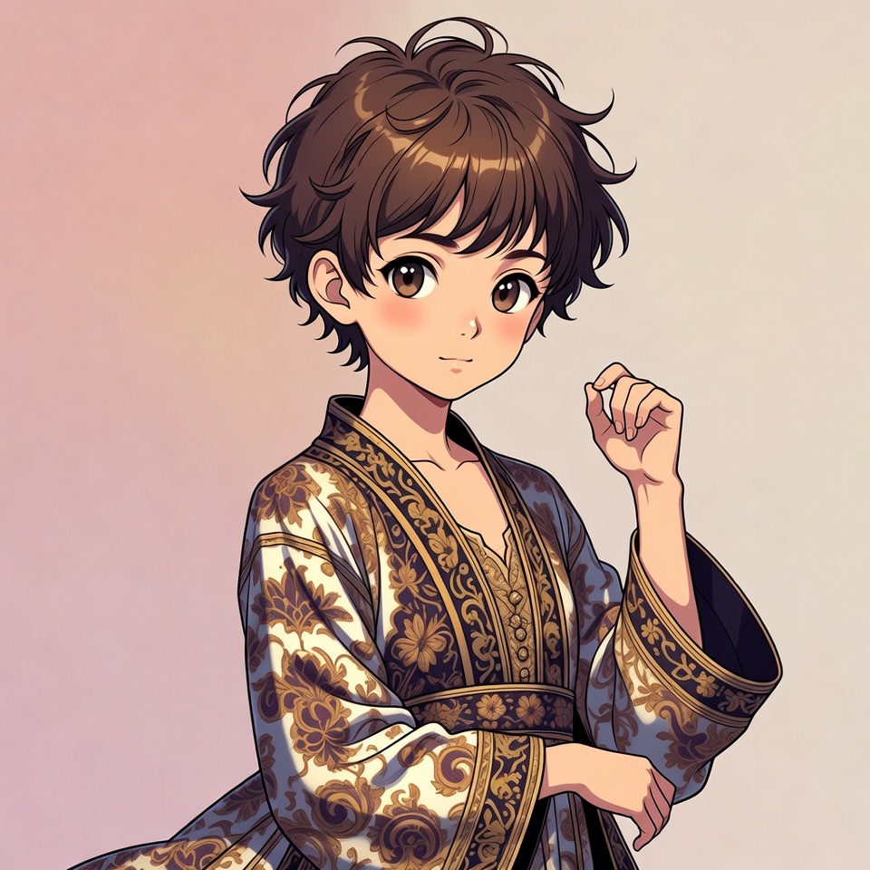 An anime girl with short curly brown hair and large expressive eyes stands posing with one hand raised. She wears a detailed gold and blue embroidered kimono with intricate floral patterns. The illustration features a soft pink gradient background.