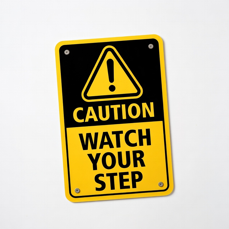 black text, exclamation mark, hazard sign, mounted sign, safety sign, safety warning, triangle symbol, warning sign, watch your step, white background, yellow sign, caution sign
