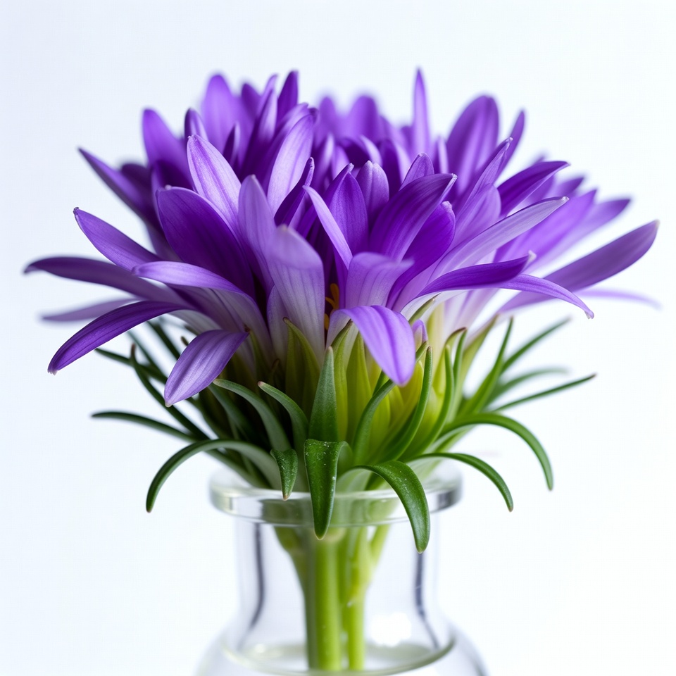 aster, bloom, botany, closeup, daisy, floral, flower arrangement, flower vase, gerbera, glass vial, green stems, isolated background, nature, petals, vibrant purple, white background, purple flower