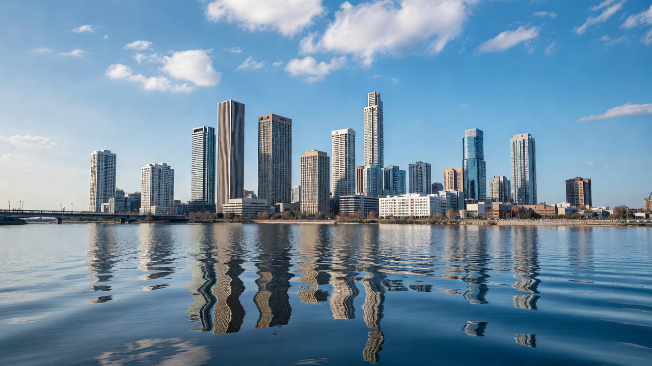 A stunning city skyline features tall modern skyscrapers and high-rise buildings along a riverbank. The clear blue water perfectly mirrors the architecture under a partly cloudy sky. A bridge spans the river in the background.
